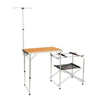 続いては、焚き火のために作られたという火周り専用テーブル。天板の半分がスチール製のメッシュになっており、熱くなったケトルやスキレットを鍋敷き無しで置くことができます。