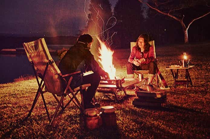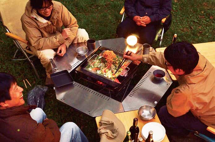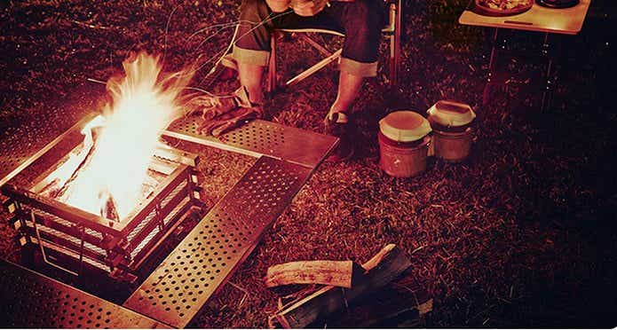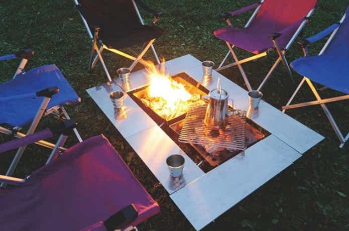 囲炉裏テーブルは、中央のスペースが空いていて、焚き火やストーブ、調理用のコンロなどの火器を中央に置いて設置できるテーブルのこと。アウトドアで焚き火台