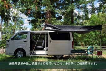 出先での着替えやデイキャンプをするときに使用しやすい、お手軽カーサイドタープ。ベルトを使用せずに吸着力の高い吸盤を取り付けて設営するタイプで、初めてカーサイドタープを使用する方でも簡単に設営ができます。