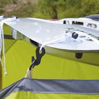 キャリアルーフやラック・クロスバーなどを搭載した車両に取り付けられるモデル。タープポールを複数使用することで、タープ単体での使用もできます。