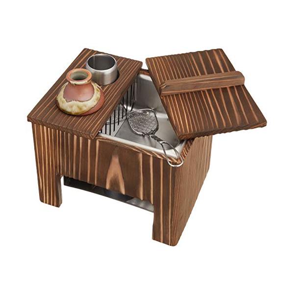 ステンレスの本体に、焼杉製のケース付き。さらに豆腐すくい、汁次、固形燃料を置く火皿が付属し、どれも本格的。