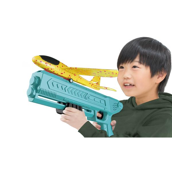 銃に飛行機をセットして飛ばして遊ぶおもちゃ。飛距離は約7mなので、こちらも自分のテントサイト内で遊べますね。全長37cmとビッグサイズの飛行機で、子供も大満足!