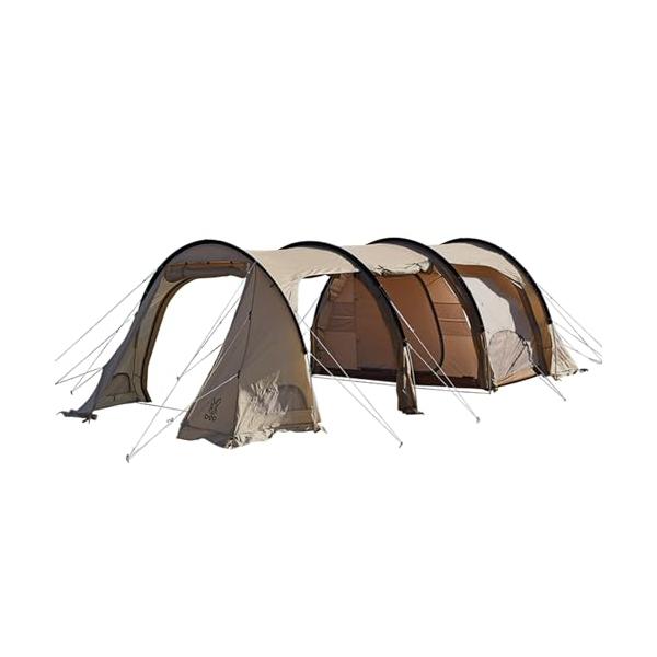 吊り下げ式インナーテントも標準装備別売りを反対側に追加すれば2寝室3ルームとなり、最大10人での就寝が可能に。ドアパネルは全て別売りポールで跳ね上げられ、スカートも完備