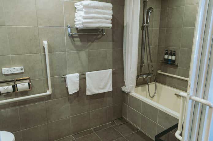 バスルームはユニットバスではなく、浴槽付きで広々快適。ここをみると、本当にリゾートホテルといった感じ。
