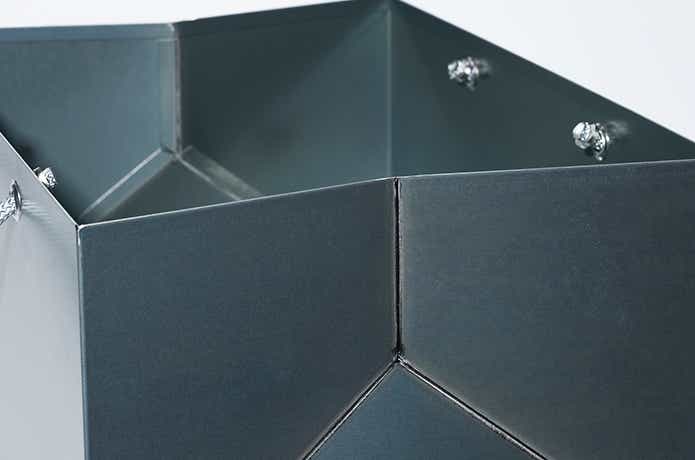 今回紹介する新作「TETSU BAG」と「TETSU KAGO」は、まるで紙袋のように片手でひょいっと持ち運べる、新感覚の鉄製コンテナバッグです。