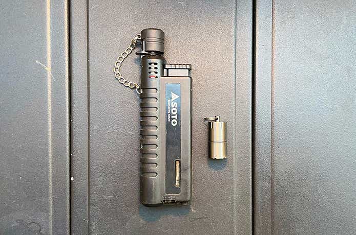 キャップを閉めた状態でのサイズは、約直径1.3×高さ2cm(実測値)。SOTO「スライドガストーチ」と並べると、カピバラとネズミくらいの差があり、同じ種(ライター)とは思えないほど。