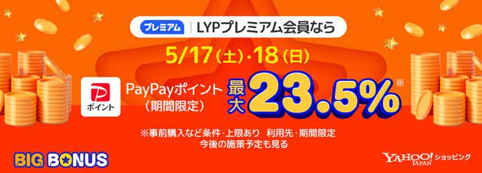 さらに、5月17日(土)0:00〜5月18日(日)25:59に開催される「2日間セール」では、ヤフービッグボーナスの魅力に加え、商品をお得に購入できるチャンスが。さらに、LYPプレミアム会員ならPayPayポイント(期間限定)※が最大23.5%もらえます。