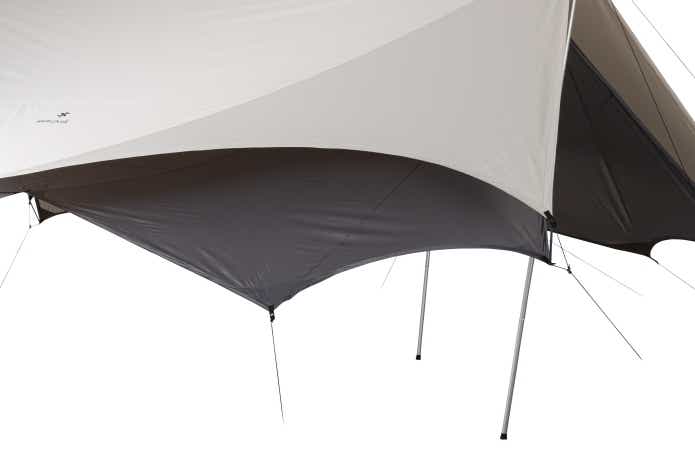 このタープのために新たに開発された生地を使用しているのも大きなポイント。外側の幕には、太陽の熱を多く含む“近赤外線”を吸収する素材「SOLAMENT®」を練り込んだ、75デニールの遮熱ポリエステル生地を採用しています。