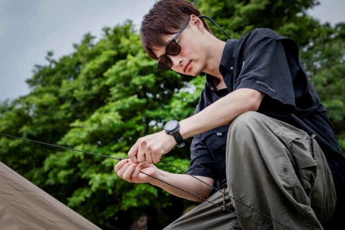TAKE:テンプル部分に凹凸のある滑り止めが付いているので、動き回ってもサングラスがずれることなく作業に集中できました。キャンプのときってサングラスの置き場に困るのですが、ネックストラップがあるとその心配もいりません。