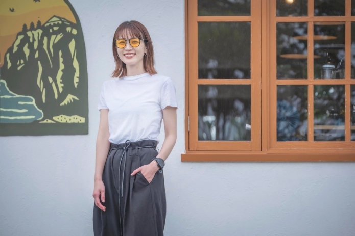 anritocamp:私が選んだ「005」は定番ウェリントンフレームの天地を高くした遊び心のあるデザインです。フレームはブラックですが、ライトイエローのレンズがアクセントになるので、街ではシンプルな白Tをあわせたい気分。普段からモノトーンな着こなしが多いので、コーディネートのハズしにも使えそう。