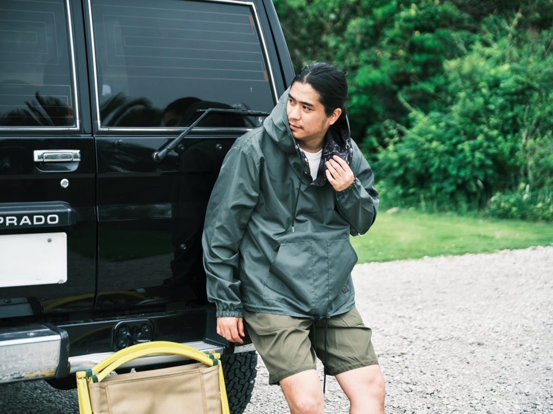 こちらは、リップストップ生地を使用した、アノラックパーカー。センターにジッパーの無いかぶりタイプのフード付きパーカーで、お腹の部分に大きめなポケットを搭載。軽い着心地で、夏の調整着に最適です。