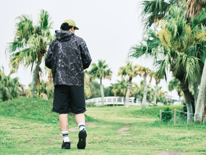 アノラックパーカーを裏返すと、裏面はシックなダークオリーブ。同じウェアなのに印象ががらっと変わります。シックにまとめたいときや、柄物のボトムスやバッグを合わせたいときにも便利。