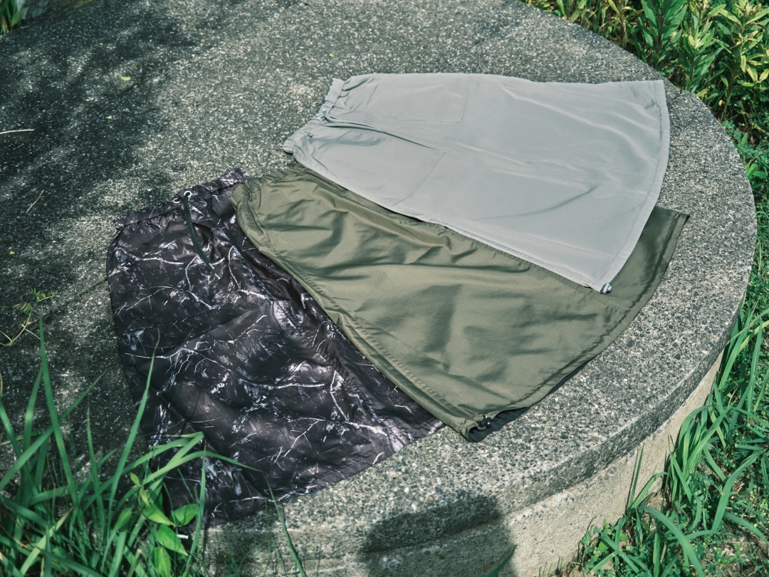 膝下丈のスカート「ノンダウン ミリタリー リバーシブル スカート」は、先に紹介したアノラックパーカー同様リバーシブル仕様で、夏のアウトドアと街でのコーデが楽しくなるアイテム。