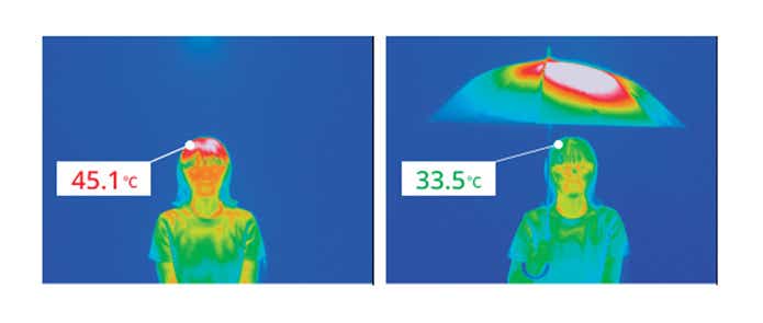 遮熱効果もバッチリ。国内の検査機関による品質試験によると、約25℃の空間で30分、太陽光を想定した人工照明を浴びたところ、傘なし・ありで頭頂部の表面温度が約11℃の差があったとのこと。