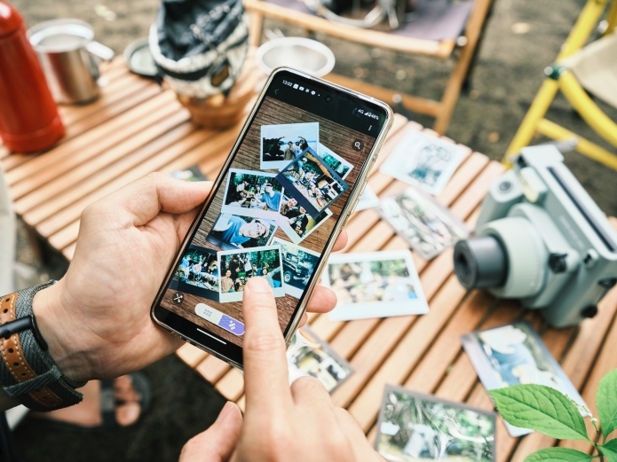 富士フイルムの公式アプリ「instax UP!™」を使ってチェキプリント™をスキャンすれば、スマホにデータとして保存が可能。友人や家族に送信したり、SNSでシェアしたりできます。