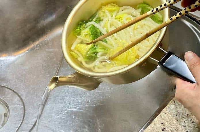 - 湯切り用の穴から麺が出てくることは、麺の太さに関わらずなかったのですが、傾けすぎると鍋のふちから溢れ出ることも。湯切りの際は念のため菜箸やトングで麺を軽くおさえると、より安心でした!