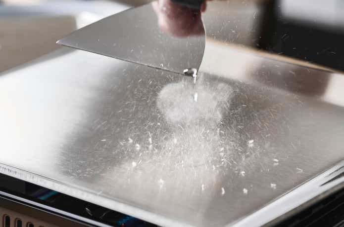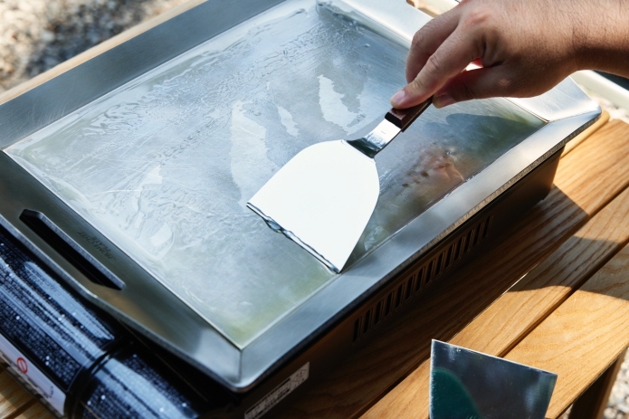 天面がとにかく頑丈なステンレス製なので、テフロンなどのコーティングが施されたプレートとは異なり、刃物を使うことができます。