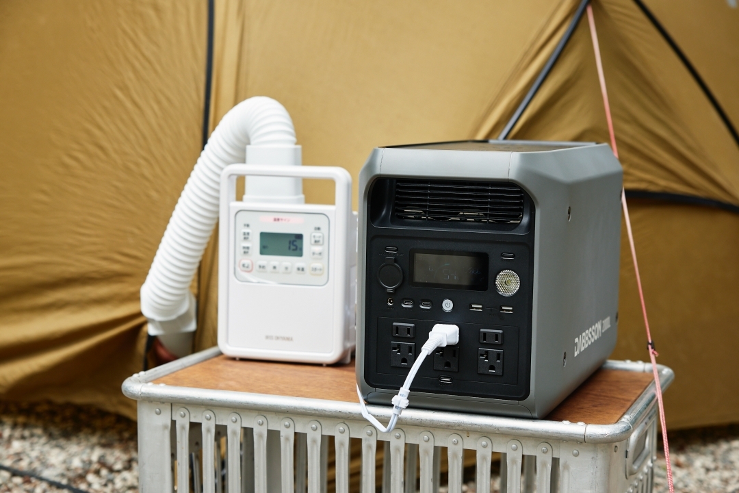 「2000L」に接続している白い家電は、小型の布団乾燥機です。夜に結露したテントや、湿った寝袋をこれで乾かせば、撤収の時短に。家に帰ってからのメンテナンスも省けます。