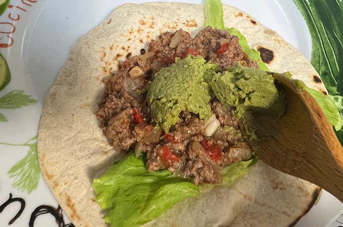 サルサミートと一緒に挟む具としてはレタスやチーズが一般的ですが、ここに解凍した「冷凍ワカモレ」もプラス! クリーミーな食感と濃厚なコクの絶品タコスの出来上がりです!