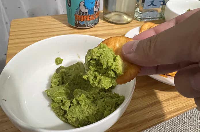 あくまでも仕事……というスタンスで?早速飲ませていただきます。うへへ。解凍した2種の「冷凍ワカモレ」のお供には、クラッカーとトルティーヤチップを用意。