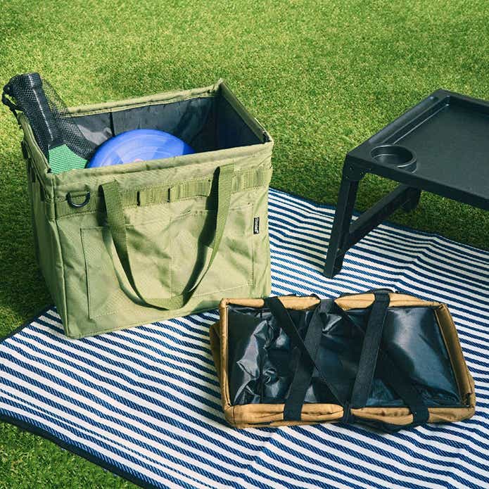 製品名は「折りたたみ式コンテナバッグ」、写真左よりグリーンとブラウンの2色展開です。