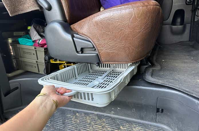 汚れた衣類や濡れたギアはもちろんドロドロのシューズも入れられるので、雨撤収も苦じゃなくなるほど。助手席でも使えるのでいろいろ放り込んでいますが、停車の反動で座席からモノが落ちることもなくなりました