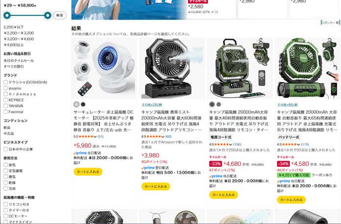 こちらは「テント内を少しでも涼しくしたい」……そんな気持ちで見ていたAmazonの画面です。今は戦車みたいな雰囲気の製品が多いようですね。
