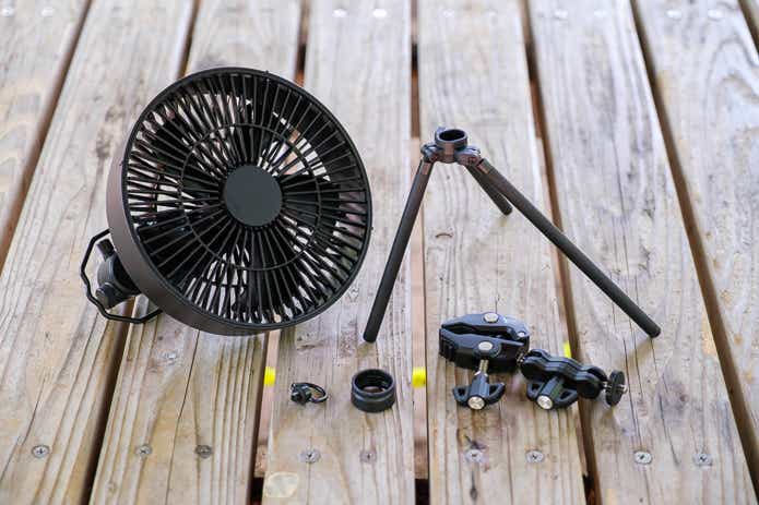 内容物を並べてみました。本体のファンに三脚、クランプ、あとは取っ手付きのねじと筒状のパーツ。