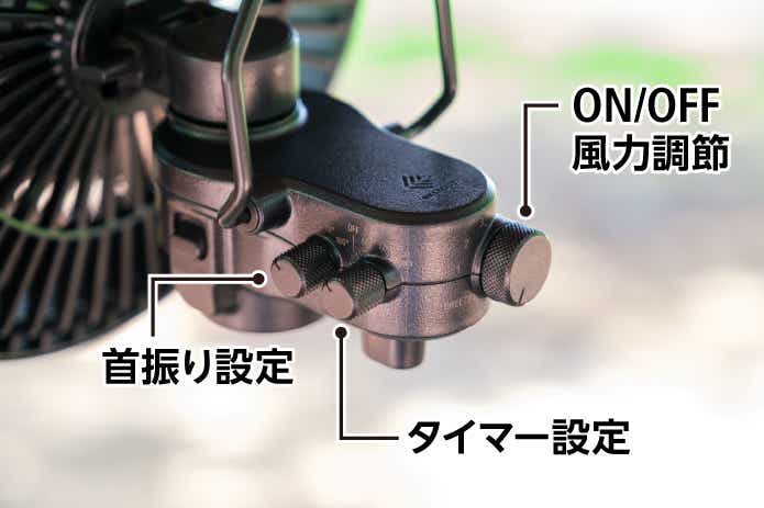 本体の裏側にはメカの部分が。ローレット加工の施されたつまみによって、いろいろな操作を行えます。風量調整に首振りにタイマーに……申し分のない機能を搭載していることがわかりますね。