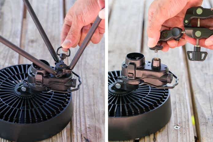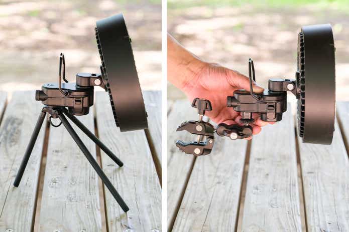 サイト設置用のパーツを装着させてみました。左が標準装備の三脚、右が今回のセットに追加で付属するクランプです。テーブル上に置いてもいいし、テントポールにも取り付け可能。これは機能的ですね。