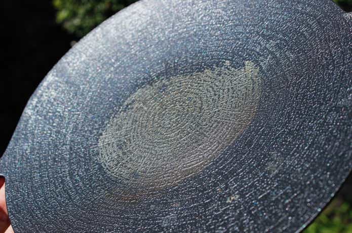 検証時に油を使わずに焦がしてしまったダイソー25cmはというと、水を入れて沸騰させても焦げは浮いてこず……。