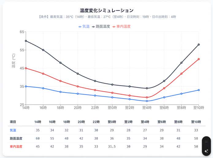 条件をいくつか変えてシミュレーションしましたが、夏場のアスファルトの上にクルマを駐めた状態では、外気温より車室内の温度が低くなるパターンが出てきませんでした。