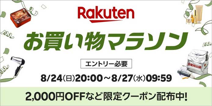 8/24(日)20:00~8/27(水)09:59まで、お買い物マラソンが開催。期間中は、条件によってお得なポイント還元キャンペーンが実施されます!