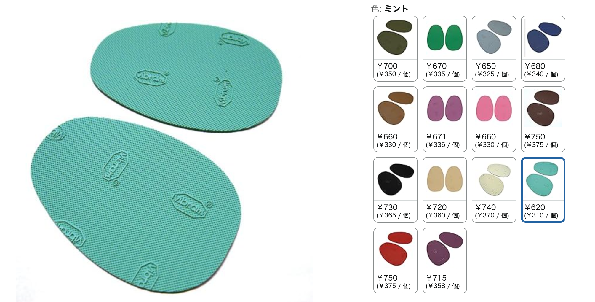 シンプルカラーからビビッドカラーまでたくさんあります。こんなカラフルなビブラムソールって市販品の靴では見かけないので、なんかテンション上がっちゃうな〜。