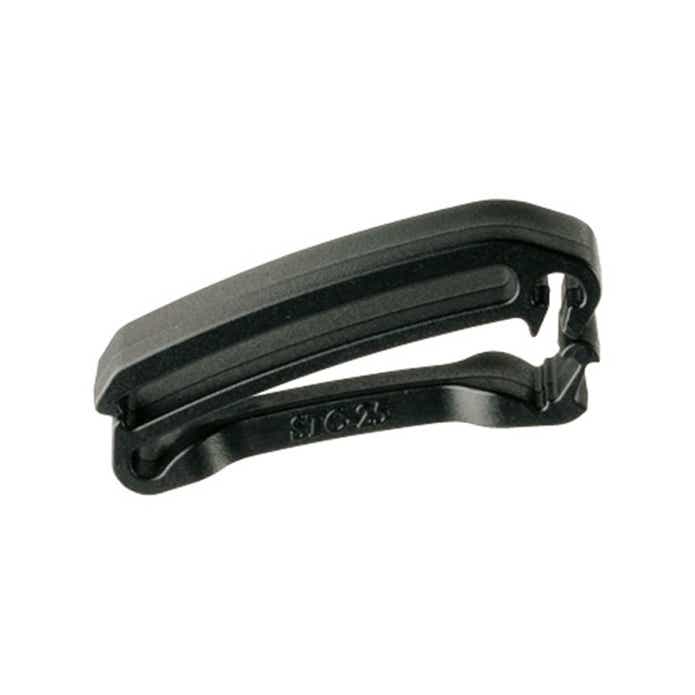 この「テープクリップ」なら、ベルトをサイドのスリットからスッと挟み込むだけ。まだ余ったら折り返し、反対側のスリットに横からスッと。