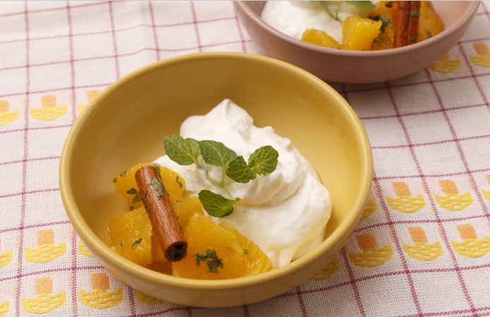 ミントは粗みじんに、果肉を取り出したオレンジは食べやすくカット。シナモンスティック・グランマルニエ・はちみつを加えてよく和え、冷蔵庫で一晩マリネします。ヨーグルトは水切りして一晩おき、器に盛ってマリネを添えれば完成!