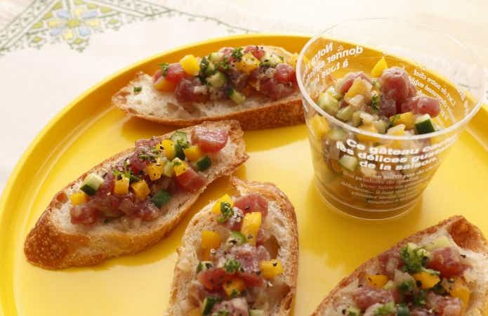 粗みじんにしたパプリカときゅうり、みじん切りの玉ねぎをボウルに入れます。そこへ5mm角にカットしたマグロと、(A)のタレを混ぜたものを加えてよく和え、塩で味を調整しましょう。仕上げはスライスしたバゲットにのせて、パセリと粗挽き黒こしょうをふりかければ完成!
