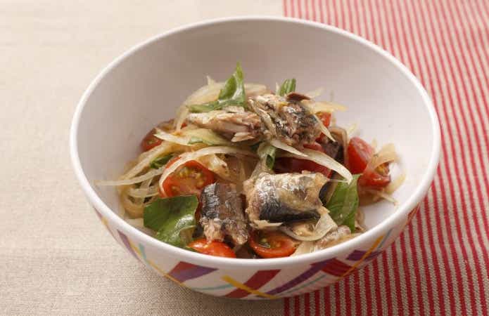 ヘタを取ったプチトマトは半分に切り、薄切りにした玉ねぎは水にさらして辛味を抜きます。ボウルに(A)を入れ、オイルサーディンを手でちぎって加え、よく混ぜましょう。そこに玉ねぎを加えて和え、仕上げにバジルをプラスすれば完成です。
