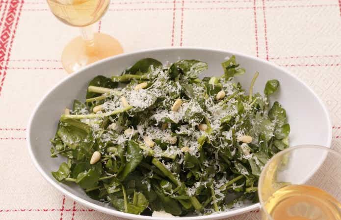 ボウルにレモン汁と塩を入れてよく混ぜ、ざく切りにしたクレソンと松の実を加えます。仕上げにオリーブオイル・チーズをかけて、全体をさっと和えたらできあがり。