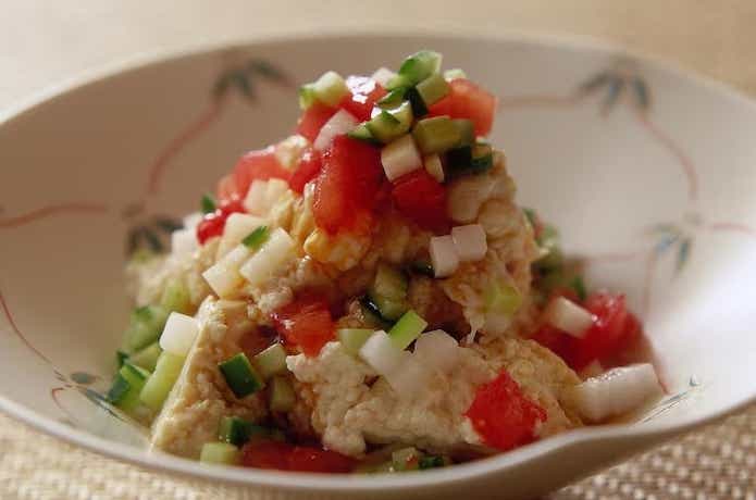 豆腐を器に食べやすい大きさにちぎって入れます。その豆腐の上に4mm角に切ったトマト・きゅうり・大根を飾り、最後にしょうゆをお好みの量かけたら完成です!