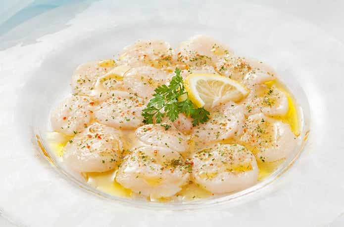 薄くスライスした帆立をお皿に丸く並べ、スパイスを全体に振りかけ、オリーブ油を回します。お好みでレモンを添えたら完成です!
