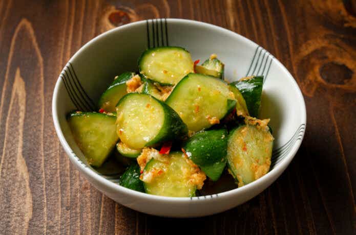 きゅうりは皮をピーラーでむき、塩をふって軽くもみ、両端を落として食べやすい大きさにカット。フードコンテナに入れて豆板醤を加え、よく混ぜます。(A)の調味料を別のボウルで混ぜ、上からかけて冷蔵庫で冷やせば完成。