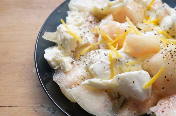 モッツァレラチーズは手でちぎっておきます。皮をむいた桃をお好みの大きさにカットし、器に盛りつけたらその上にモッツァレラをのせ、塩と黒こしょうをふります。仕上げにゼスターで削ったレモンの皮・オリーブオイル・白ワインビネガーをふりかけたら完成!