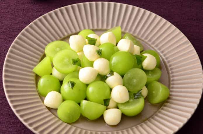 シャインマスカットや皮をむいた巨峰を盛りつけ、手でちぎったモッツァレラチーズを添えます。(A)とすりおろしたレモンの皮をかけ、仕上げにミントを添えたら完成。