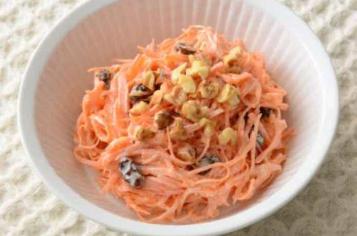 にんじんは5cmのせん切りにして塩をふり、しんなりしたら水気を絞ります。クリームチーズを耐熱ボウルに入れてレンジ(500W)で10秒加熱し、ドレッシングとこしょうを混ぜます。にんじん・レーズンを加えて和え、器に盛ってくるみをトッピングすれば完成!