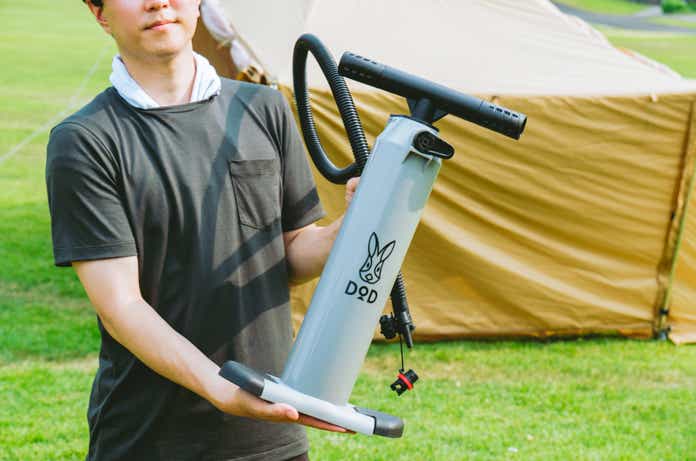 テントだけでなく、SUPなど大型のエアーアイテムを膨らませることもできるように設計されていて、ポンプ1つでもただでは済まないところにDODのこだわりを感じます。