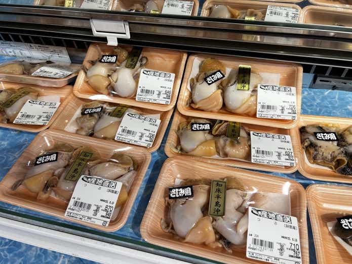 番外編として紹介したいのが、斜里町のスーパーマーケット「ビッグマートみたに」の鮮魚コーナーで買った「生つぶ貝」。とにかく安くて大きい!