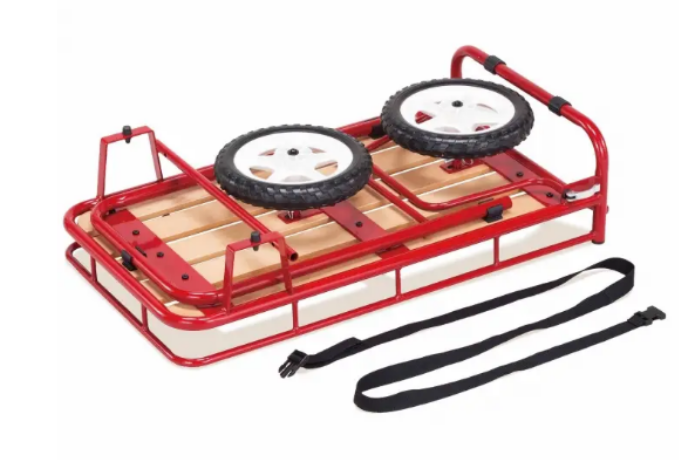 コンパクトに収納できる2輪タイプのアウトドアキャリーカート。引き手とタイヤは取り外してカート裏にぴったり収まる設計で、持ち運びや保管もスマートです。キャンプサイトではクーラーボックスや荷物置きとしても活躍します。