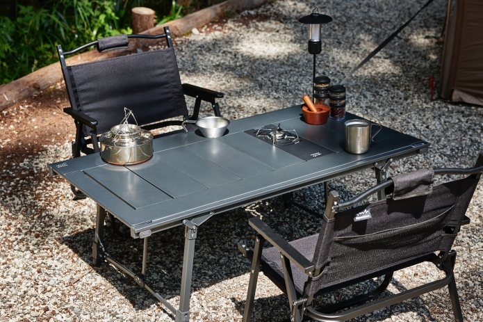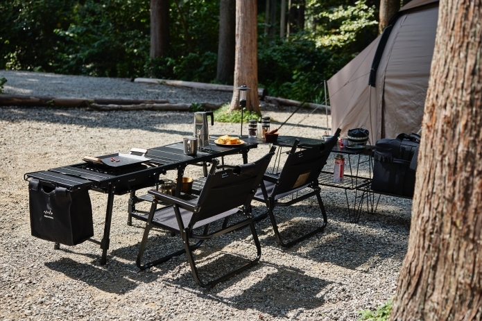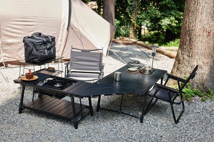 新しいオプションの追加で、さらに死角が無くなった「アルミユニットテーブル」シリーズ。ソロやデュオ、ファミリー、グループなど、シーンに合わせた組み替えの自由度がめちゃめちゃアップしています。