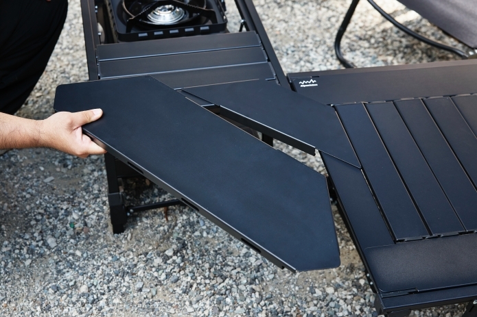 通常盤のアルミユニットテーブルに付属するのは、写真右の折り畳みできる天板ですが、樹脂パーツを使用しているので、熱したクッカーを直接置くには少し不向きでした。